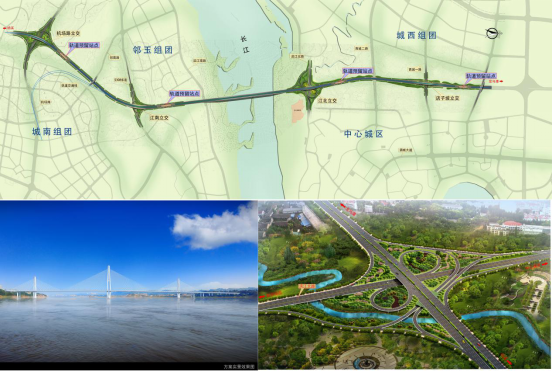 建設(shè)規(guī)模及內(nèi)容:起于城南組團(tuán)現(xiàn)狀機(jī)場(chǎng)路,起點(diǎn)與機(jī)場(chǎng)路相交形成全互通立交,后沿城南組團(tuán)規(guī)劃路網(wǎng)外側(cè)前進(jìn)依次跨越S308省道、藍(lán)田機(jī)場(chǎng)、濱江南路、長(zhǎng)江后在江陽(yáng)區(qū)福利山處上岸,向北延伸經(jīng)江北立交、店子坡立交,終點(diǎn)至設(shè)計(jì)已完成的馬屋基立交,路線全長(zhǎng)約7.512Km,城市快速路,設(shè)計(jì)時(shí)速80km/h,雙向八車道(遠(yuǎn)期為雙向6車道加軌道通道)。項(xiàng)目包含跨越長(zhǎng)江特大橋一座,全互通立交兩座、部分互通立交一座、簡(jiǎn)易互通立交一座及人行過(guò)街系統(tǒng)。