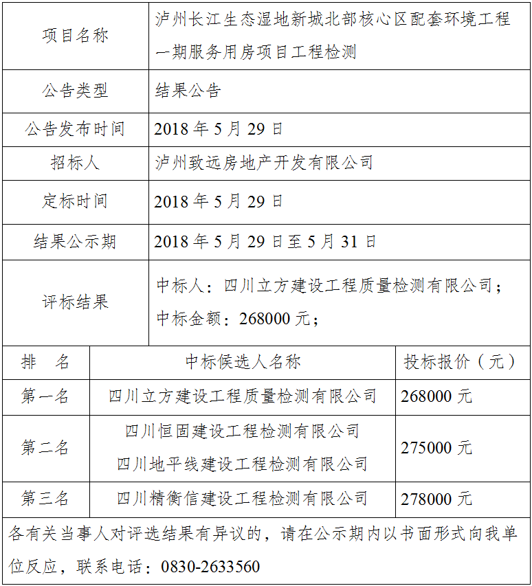 致遠公司關(guān)于瀘州長江生態(tài)濕地新城北部核心區(qū)配套環(huán)境工程一期服務(wù)用房項目工程檢測結(jié)果公告