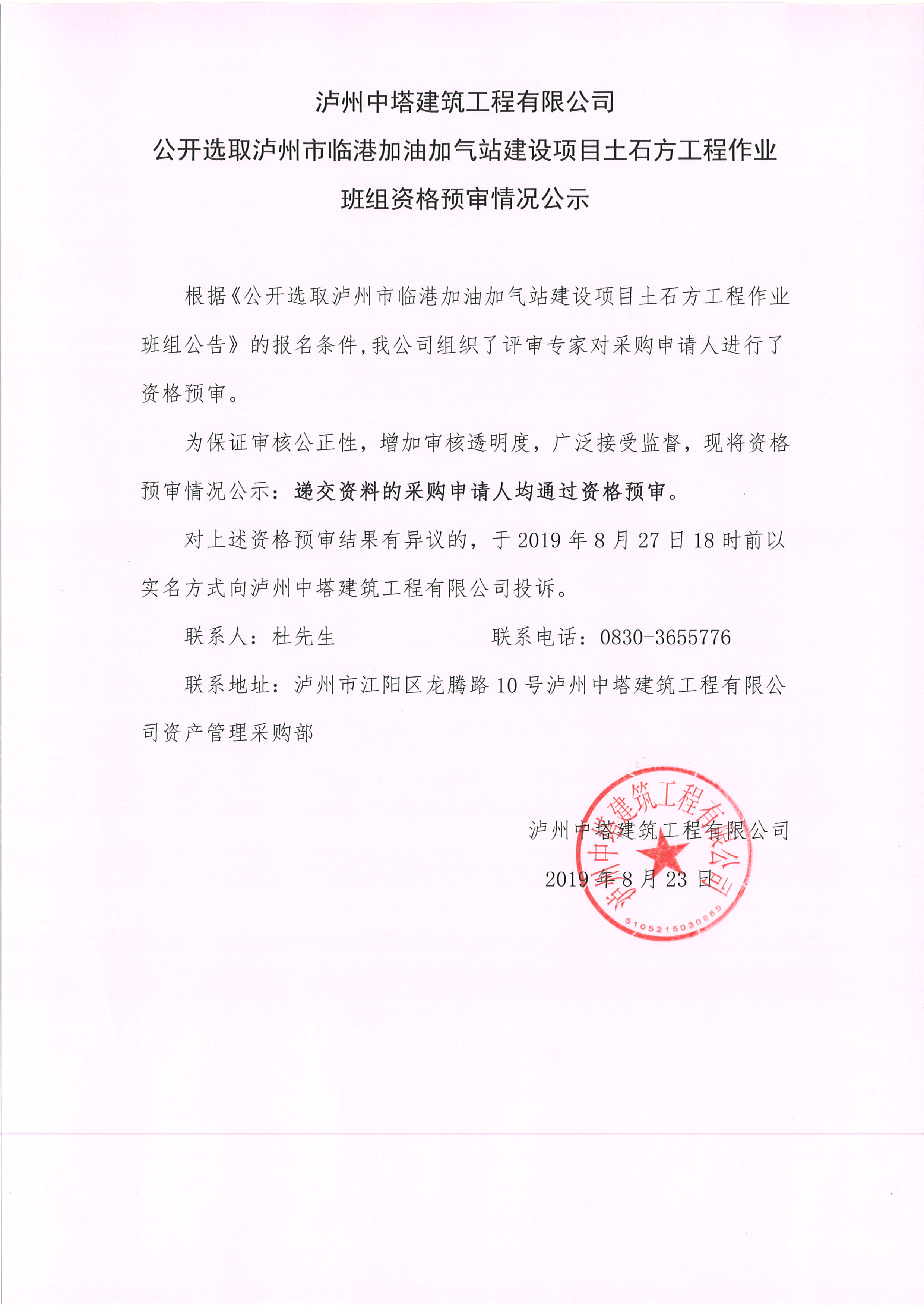 公開選取瀘州市臨港加油加氣站建設(shè)項(xiàng)目土石方工程作業(yè)班組資格預(yù)審情況公示