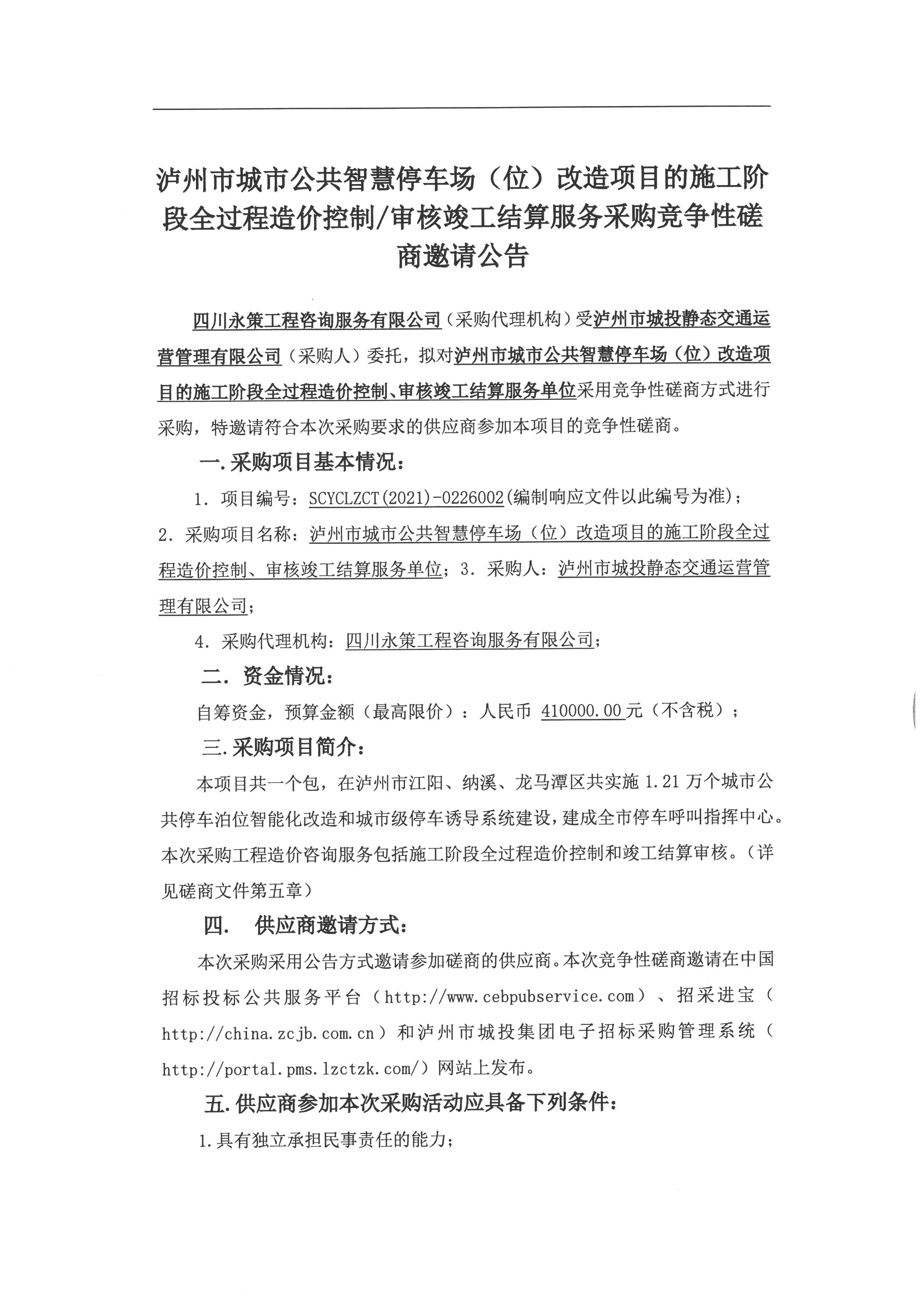 瀘州市城市公共智慧停車場(位)改造項目的施工階段全過程造價控制/審核竣工結算服務采購競爭性磋商邀請公告