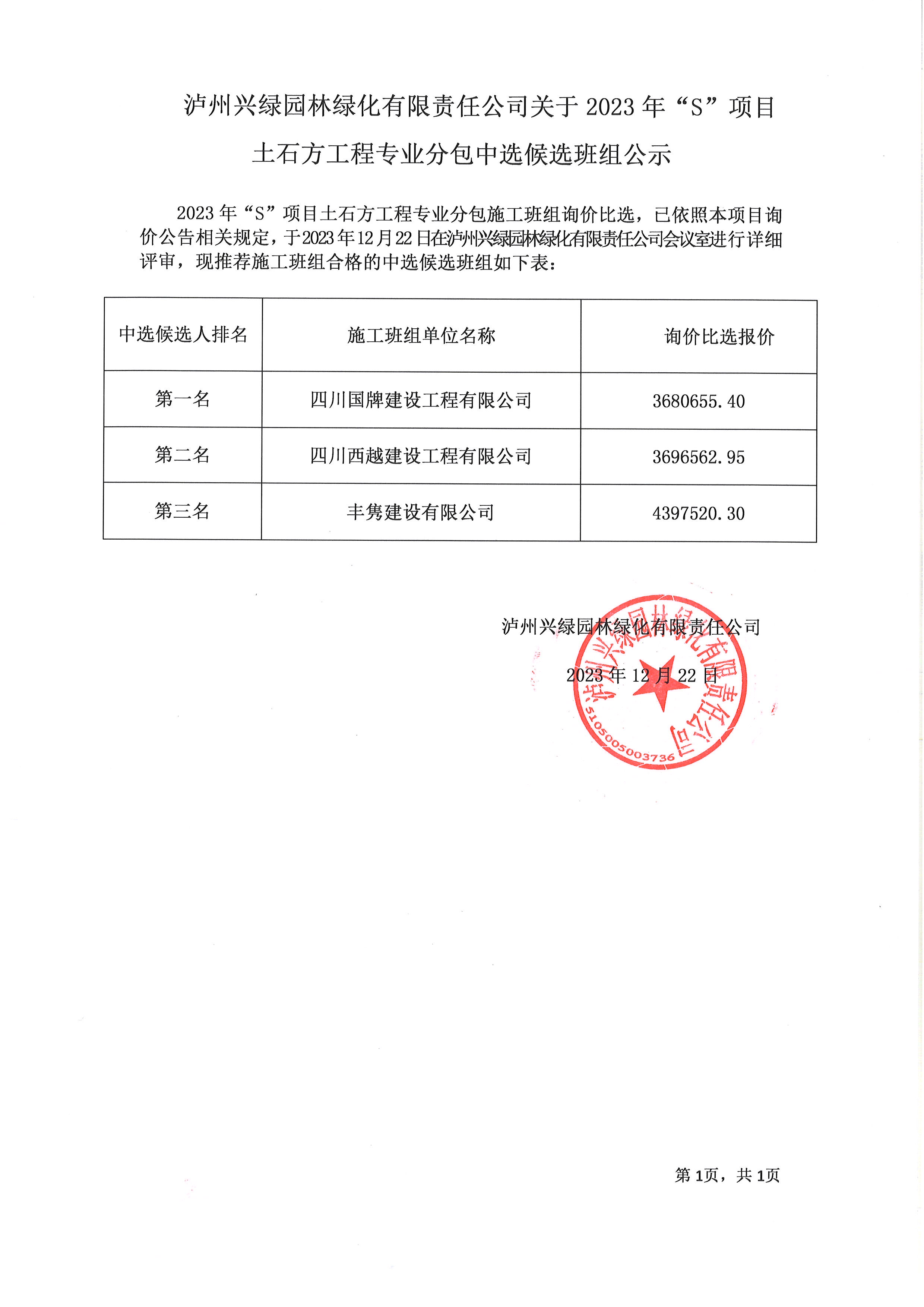 2023年“S”項(xiàng)目土石方工程專業(yè)分包中選候選班組公示